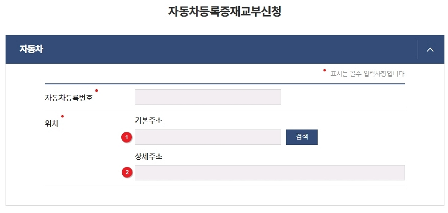 메인 화면에서 '자동차등록증 재발급' 서비스를 검색하거나, 민원 신청 메뉴를 통해 해당 페이지로 이동합니다. - 신청 정보 입력