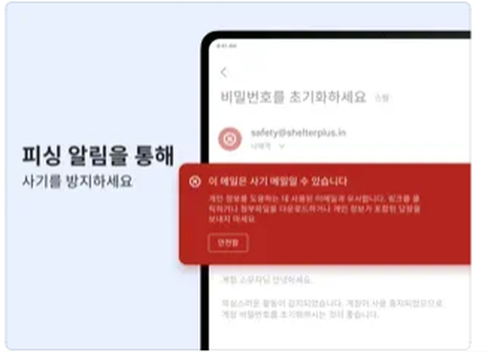 2단계 인증(2FA)을 포함한 보안 기능이 강화되어 있으며, 의심스러운 메일은 자동으로 스팸함으로 분류됩니다. 사용자는 알림을 통해 보안 관련 사항을 즉시 확인할 수 있습니다.